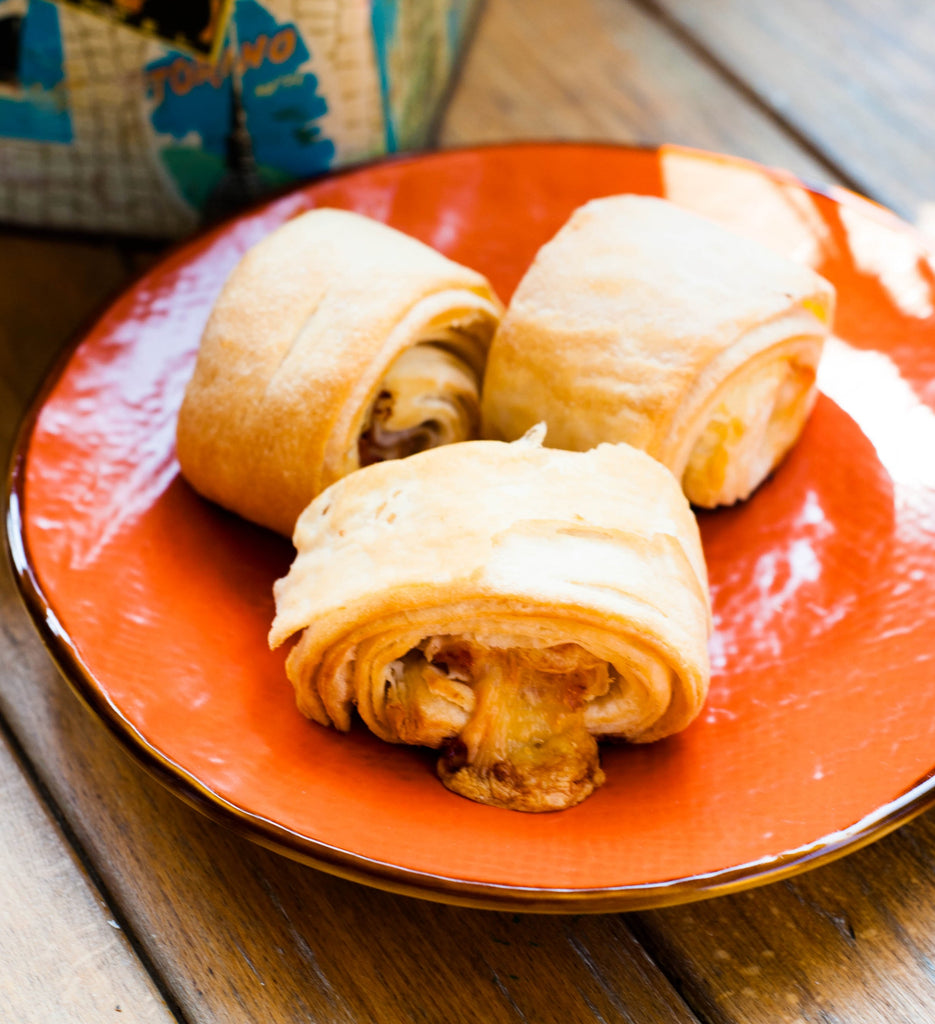 Pasta sfoglia salata in formato mignon farcita con prosciutto cotto e formaggio.