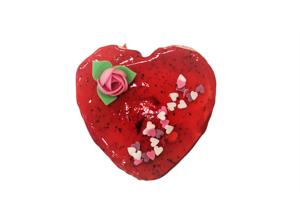 Pan di spagna a forma di cuore ricoperto con mousse alla fragola. Decorazioni Festa della Mamma.